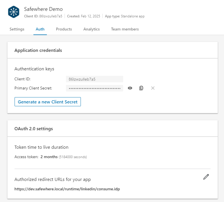 - Client secret: The secret code automatically generated by LinkedIn.